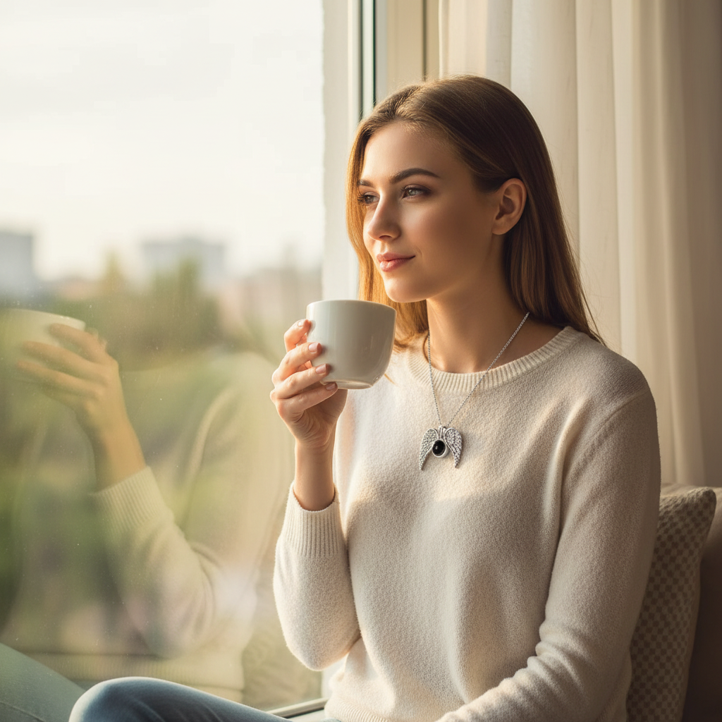 Elegante Engelsflügel umrahmen Ihr persönliches Foto. Lassen Sie Licht darauf scheinen, um verborgene Erinnerungen zum Vorschein zu bringen. Ein wunderschönes Andenken, das Ihre Lieben immer in Ihrer Nähe hält.